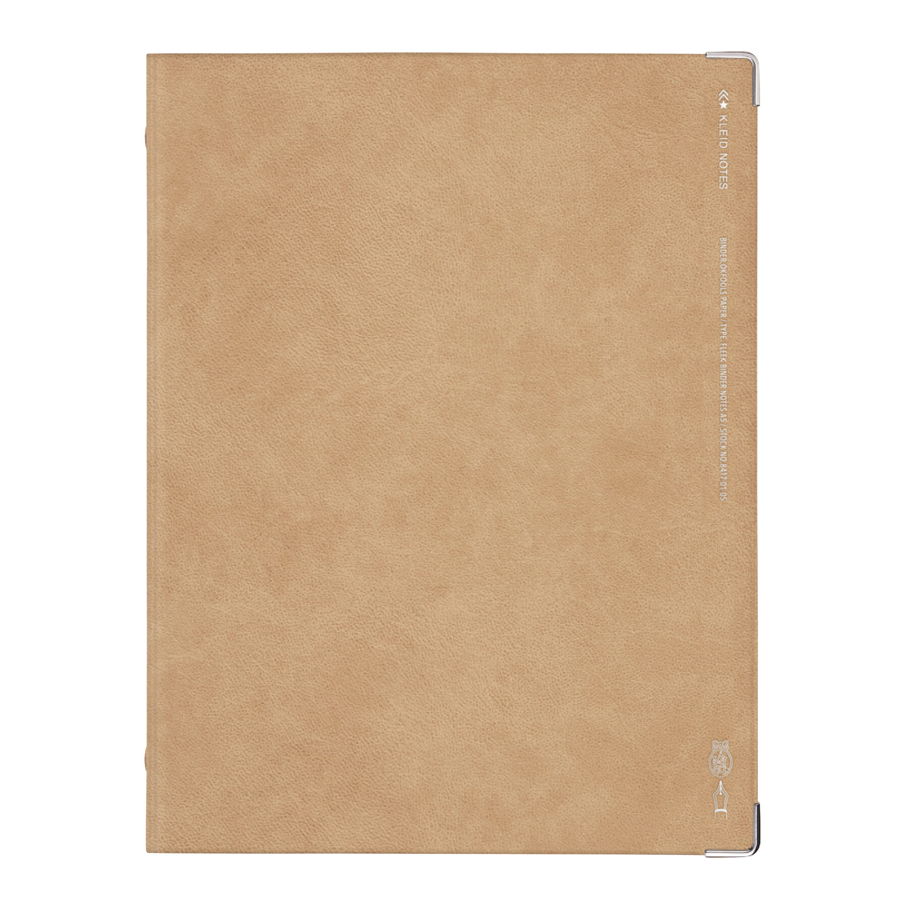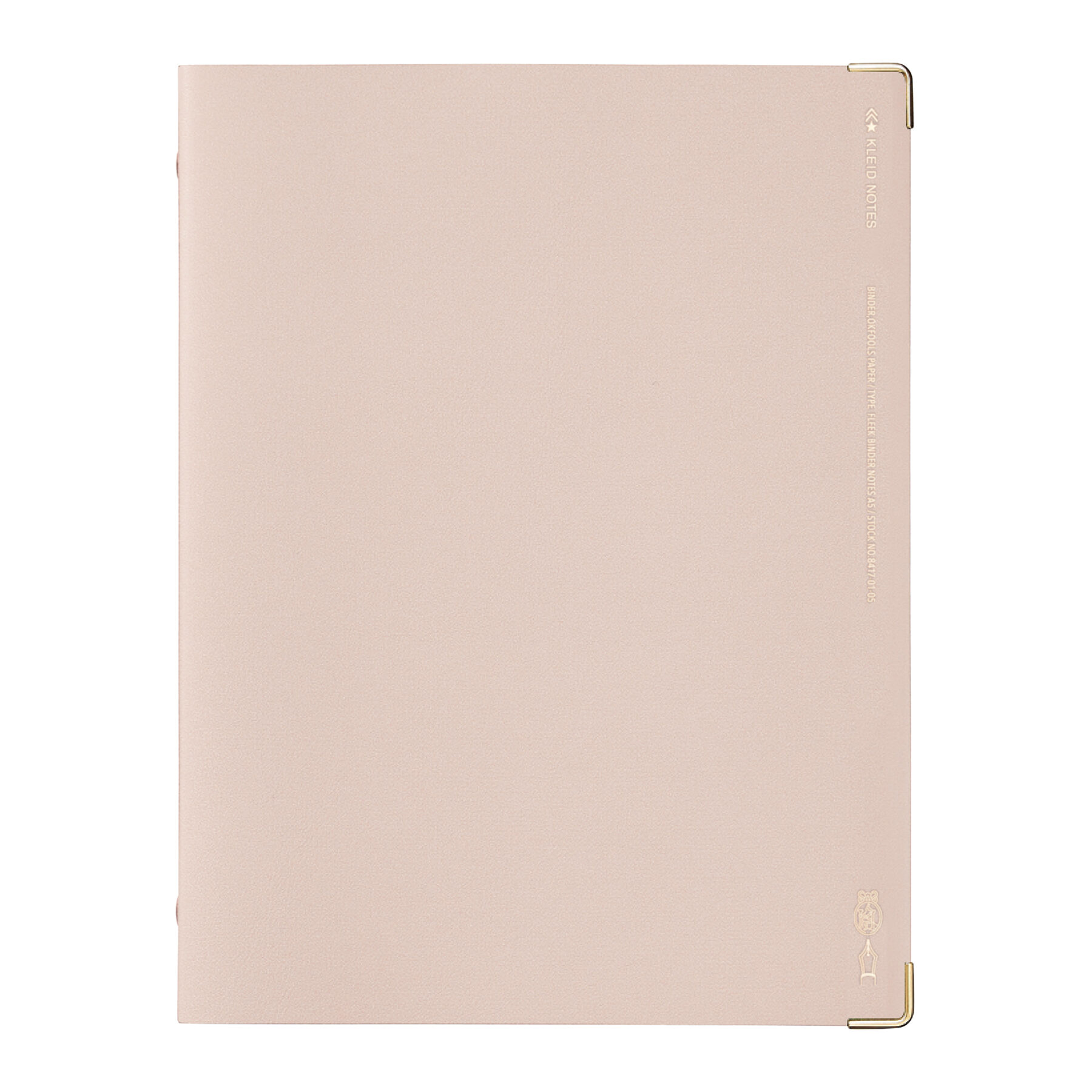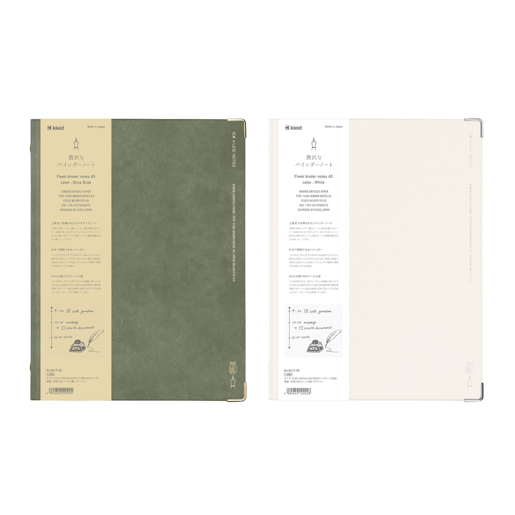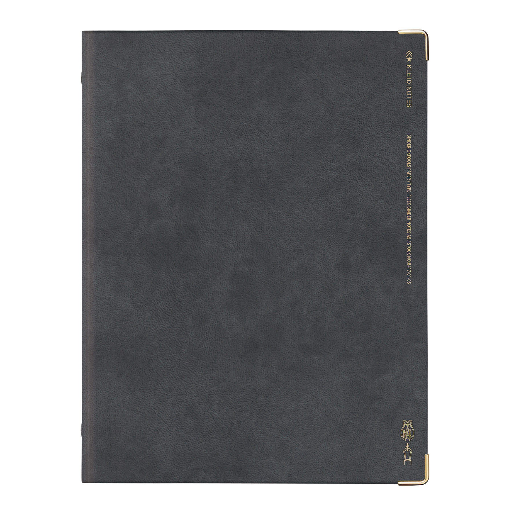 トレンドカラーにコーナー金具がアクセント。手触りの良いレザー調カバーを使用したラグジュアリーなバインダーノート。片手で簡単に開閉でき、間のリングを省くことにより書きやすさを実現。用紙は高級筆記専用紙「OKフールス紙」を使用。