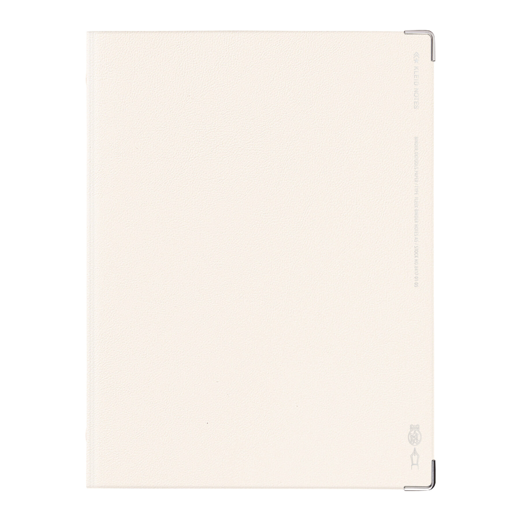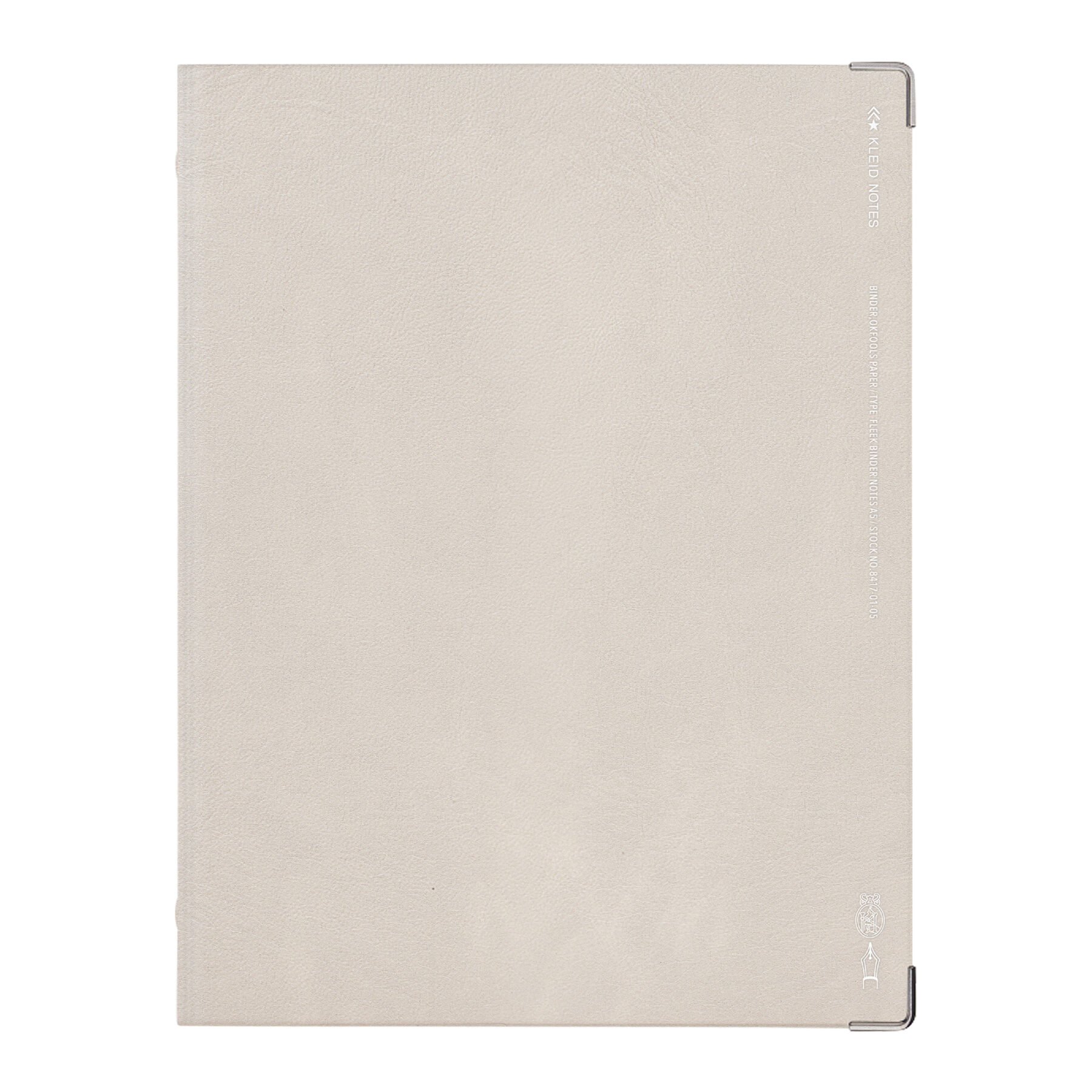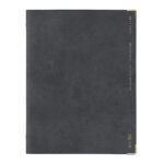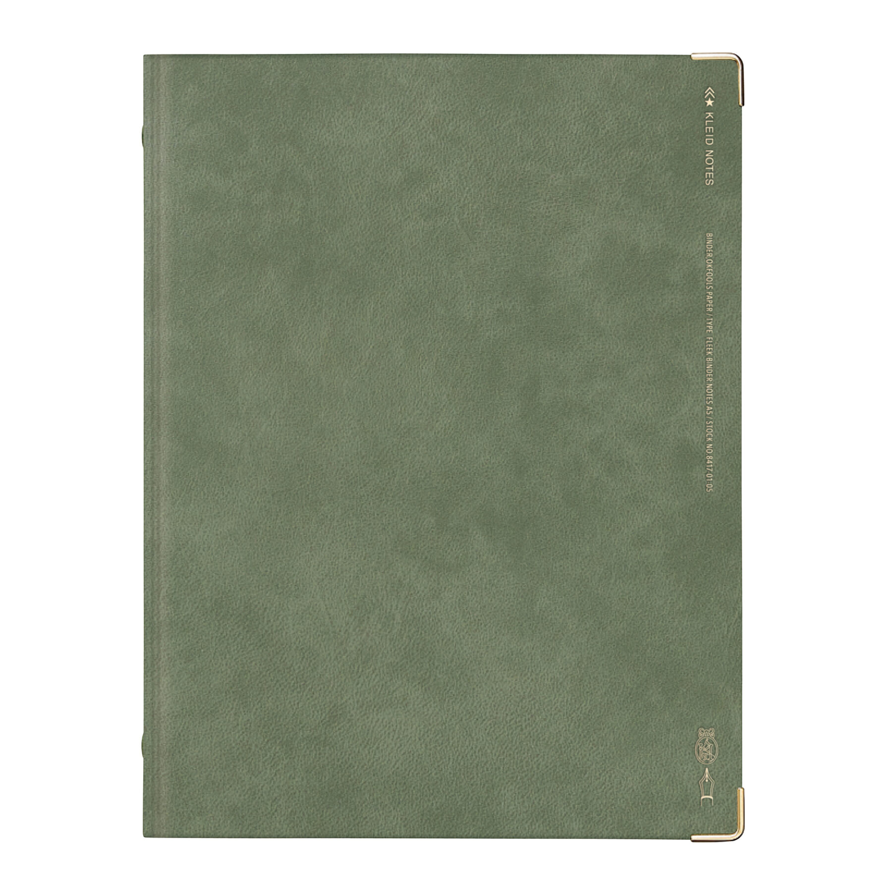 トレンドカラーにコーナー金具がアクセント。手触りの良いレザー調カバーを使用したラグジュアリーなバインダーノート。片手で簡単に開閉でき、間のリングを省くことにより書きやすさを実現。用紙は高級筆記専用紙「OKフールス紙」を使用。