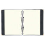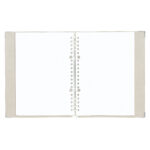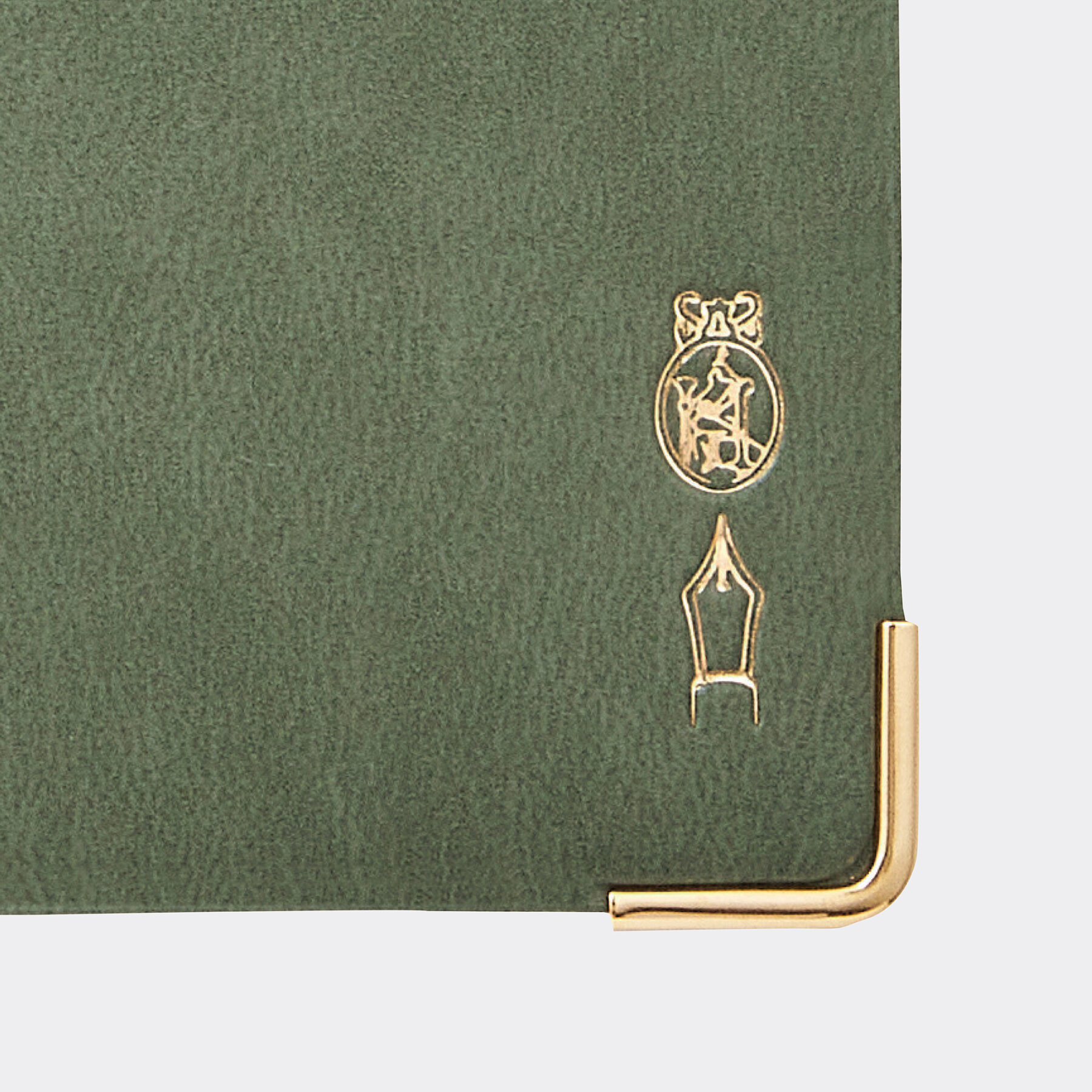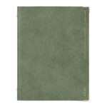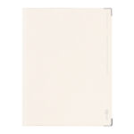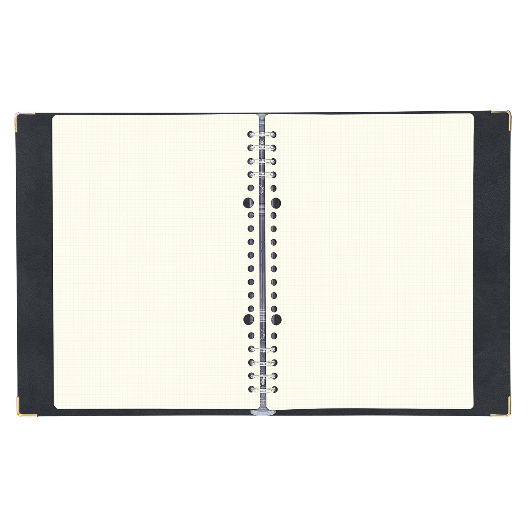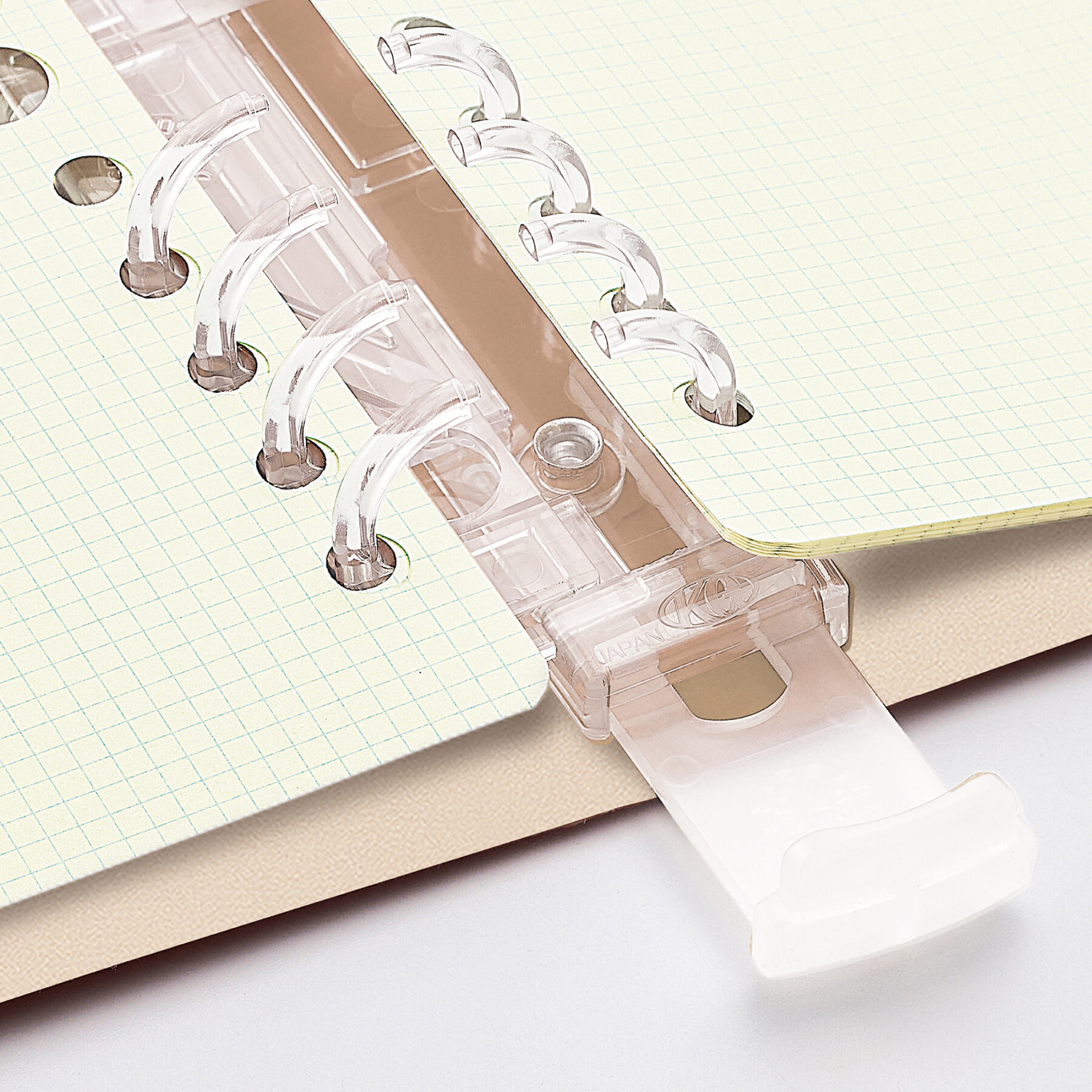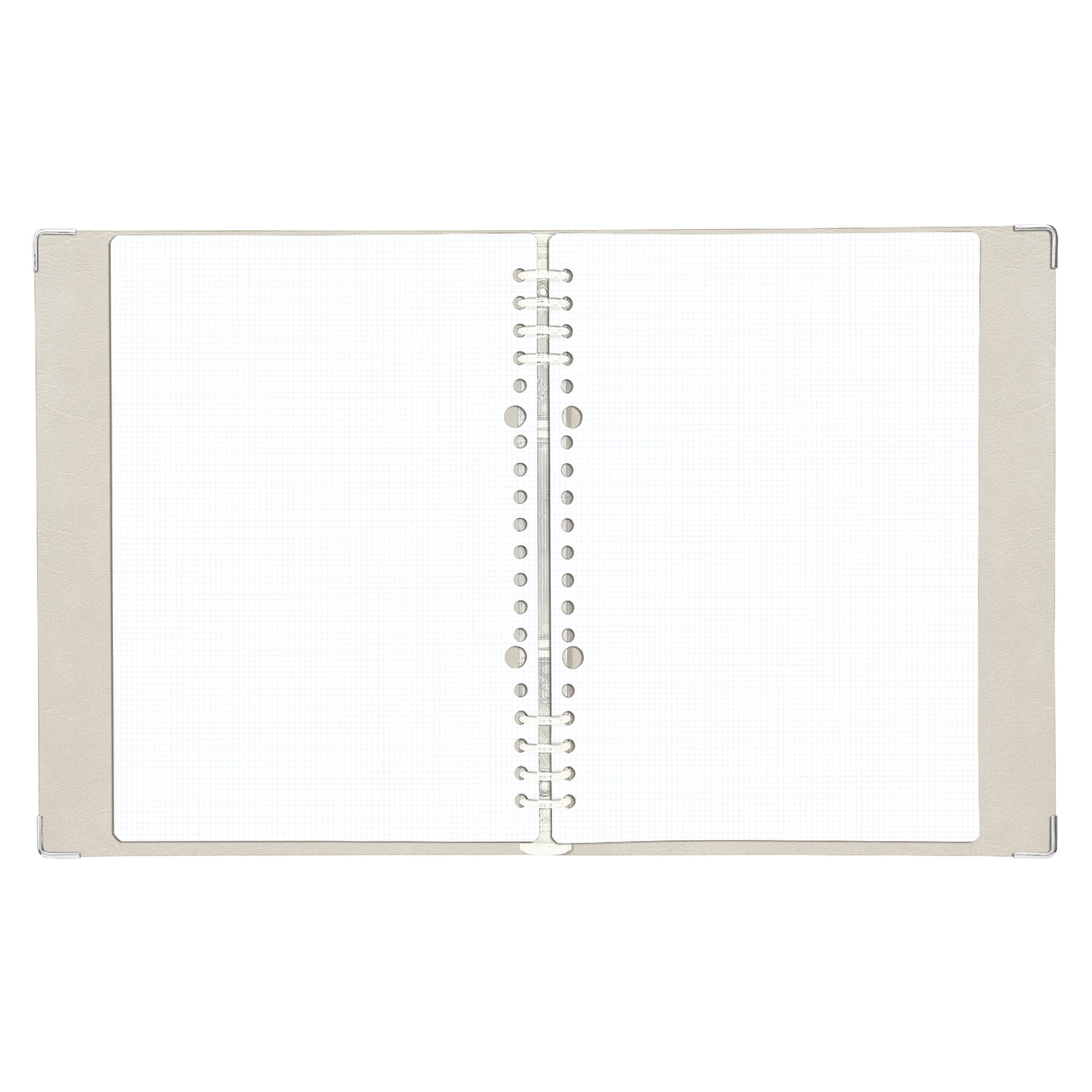トレンドカラーにコーナー金具がアクセント。手触りの良いレザー調カバーを使用したラグジュアリーなバインダーノート。片手で簡単に開閉でき、間のリングを省くことにより書きやすさを実現。用紙は高級筆記専用紙「OKフールス紙」を使用。