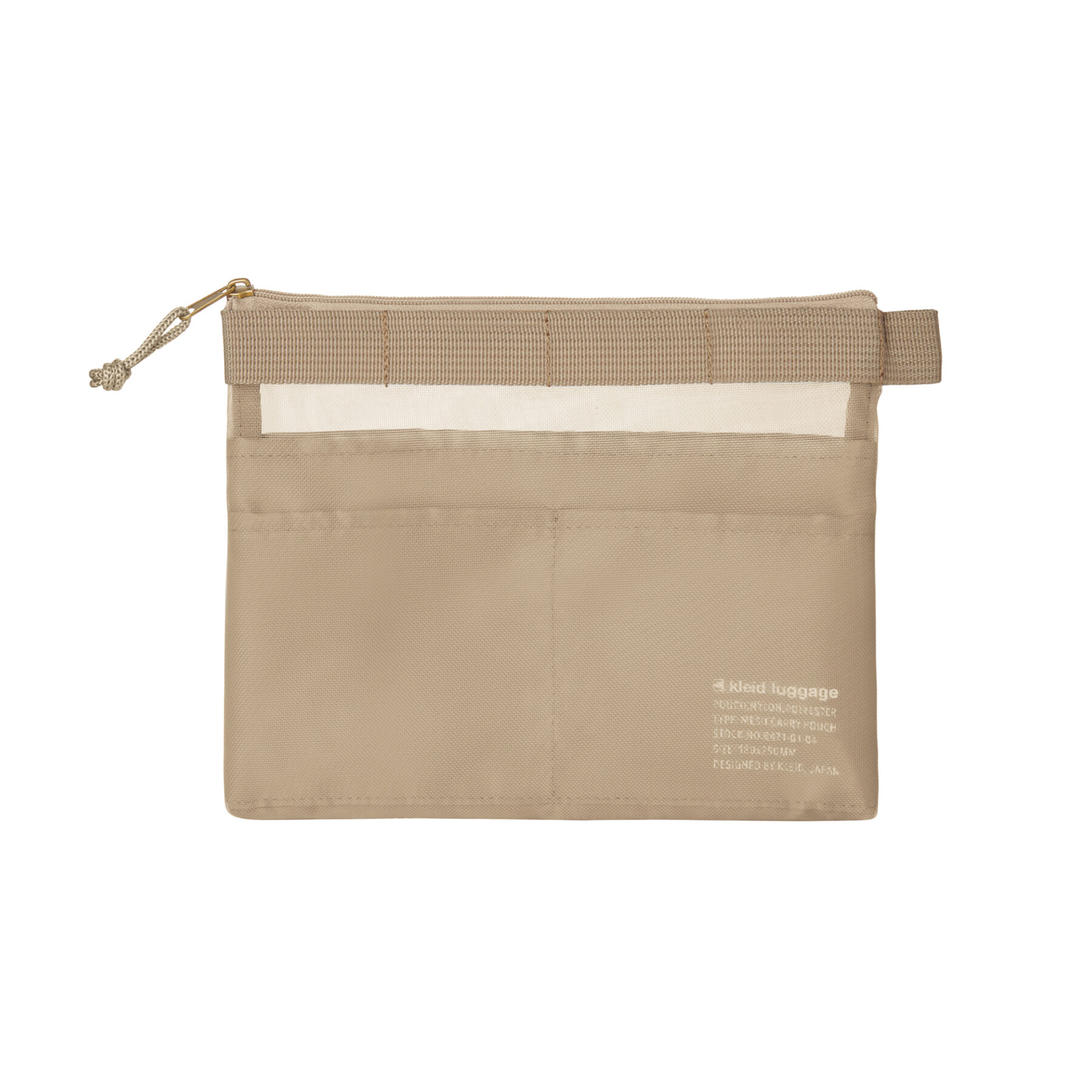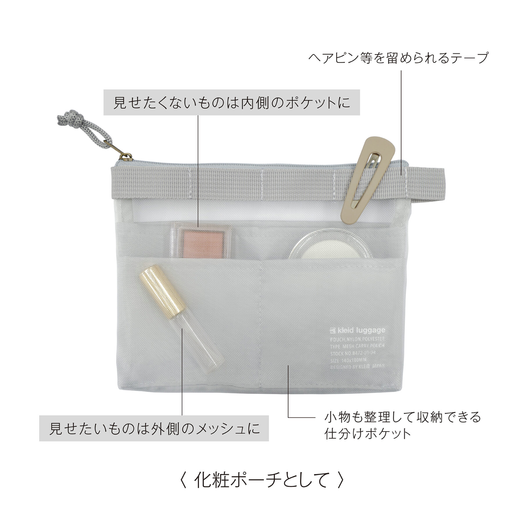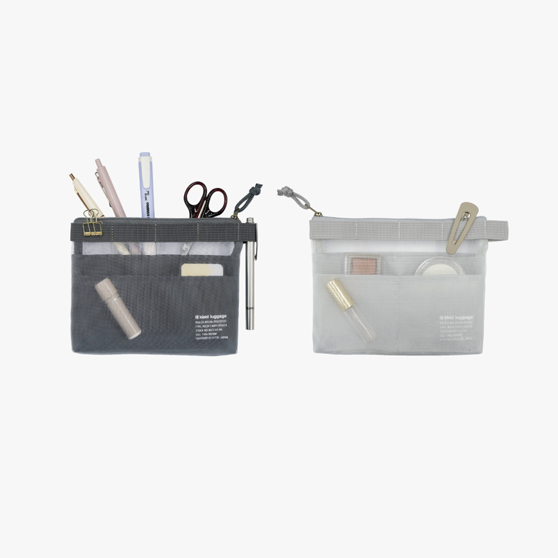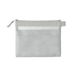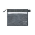 見せたいものをメッシュ(外側)に、見せたくないものをポケット(内側)に使い分けて収納可能。A6サイズのノートが入り、文房具ポーチとしても、コスメポーチとしても使い勝手の良いサイズ感に仕上げました。