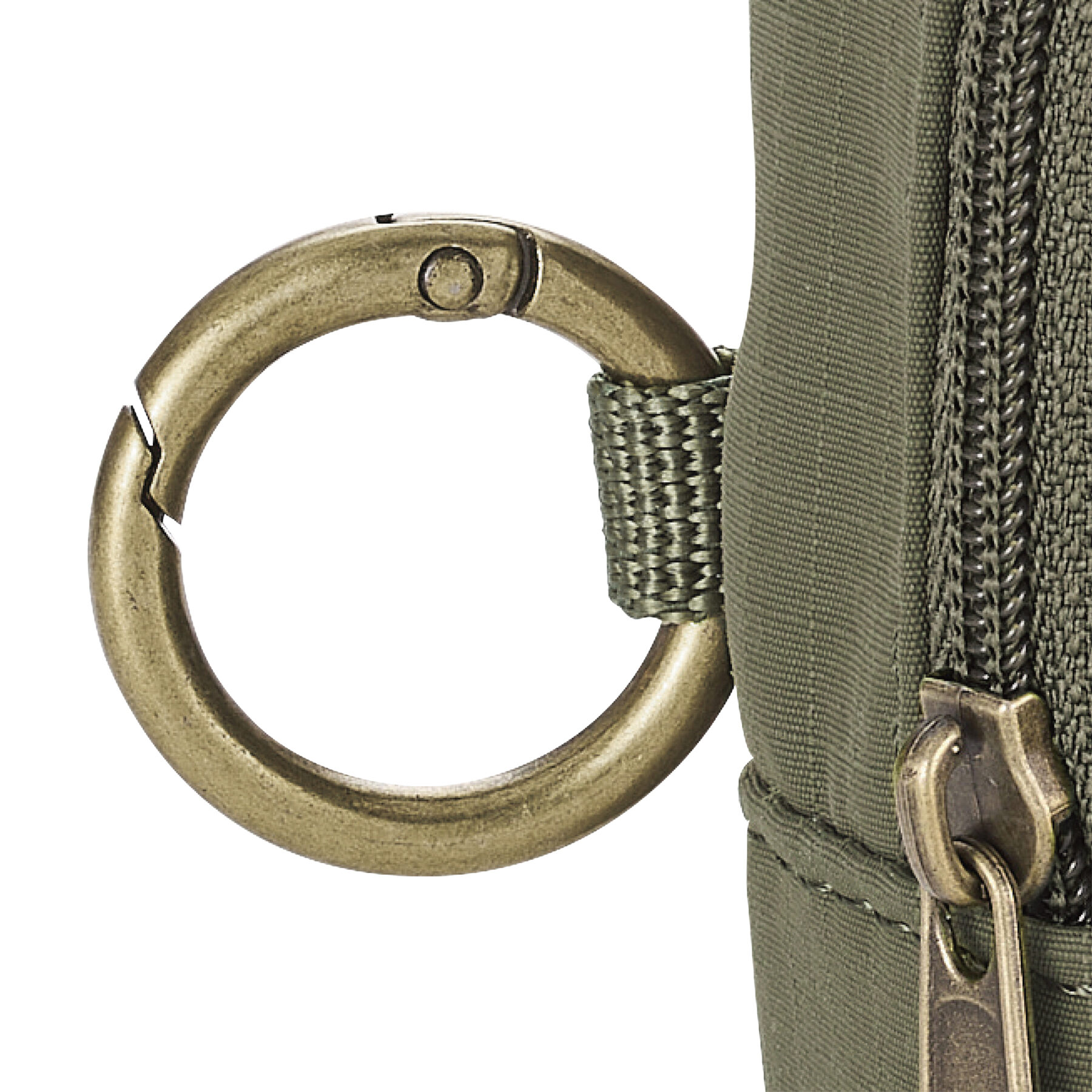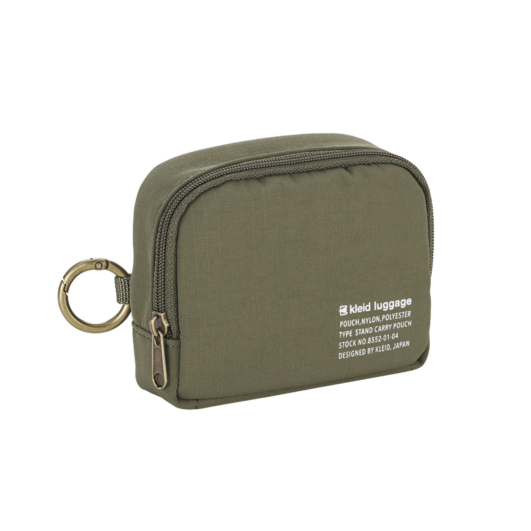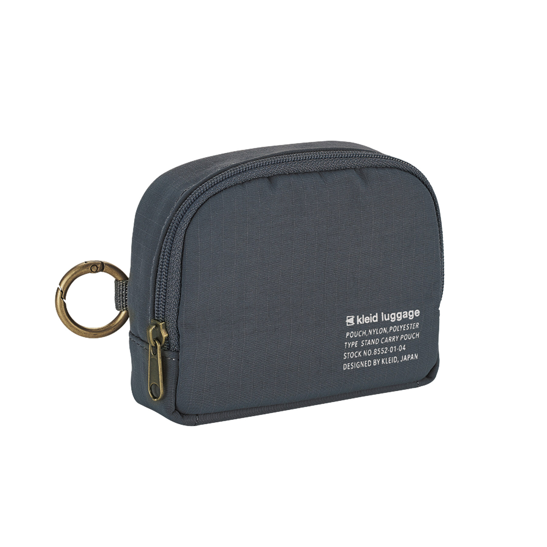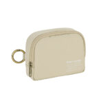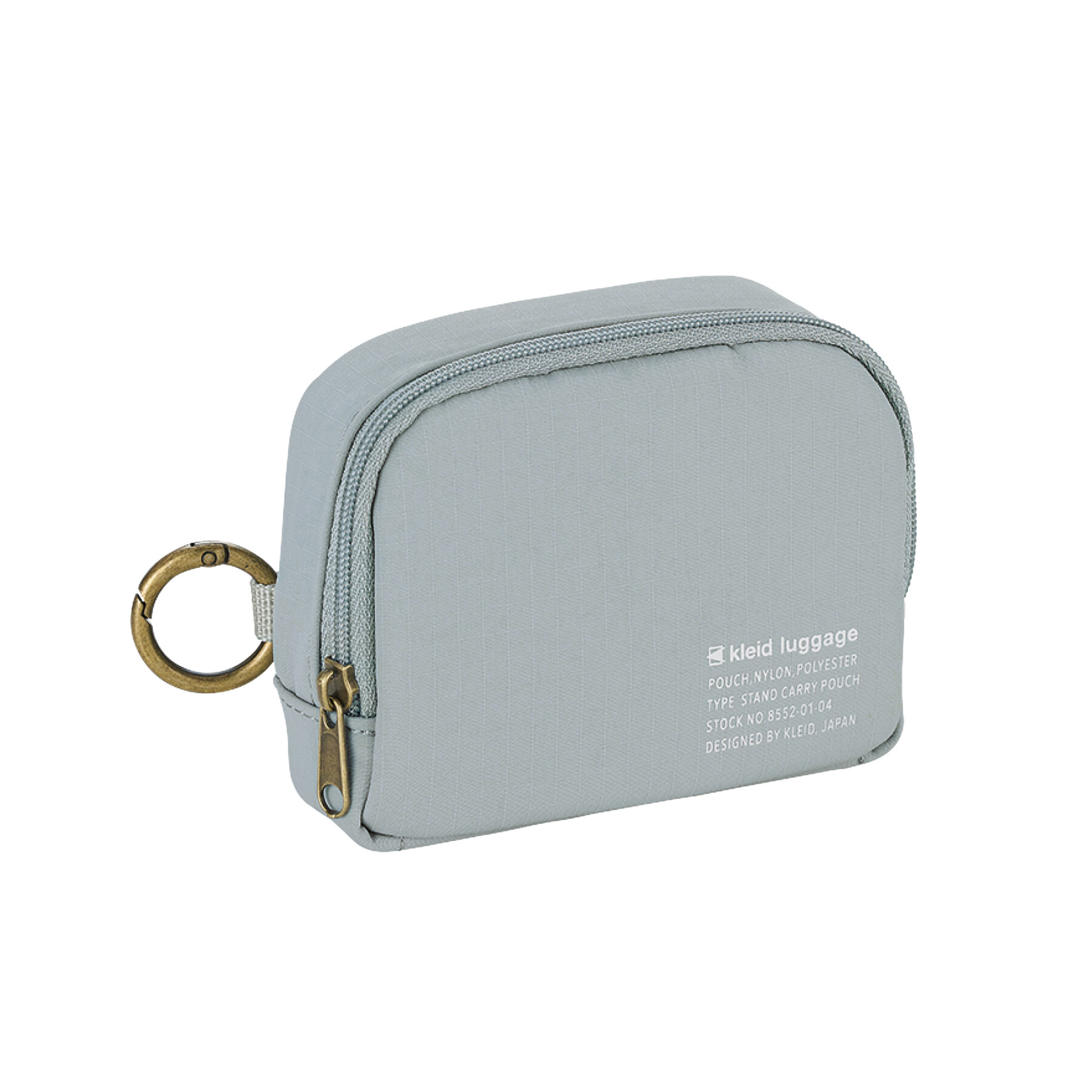 撥水加工を施した、しなやかでハリのある生地に、アンティークゴールド色のカラビナがアクセント。バッグに外付けできるミニサイズながらも、広いマチで収納力を確保。ワイヤレスイヤホン、リップや目薬など小物の持ち運びに最適。外出先でスマートフォンを立てて、動画なども楽しめます。