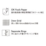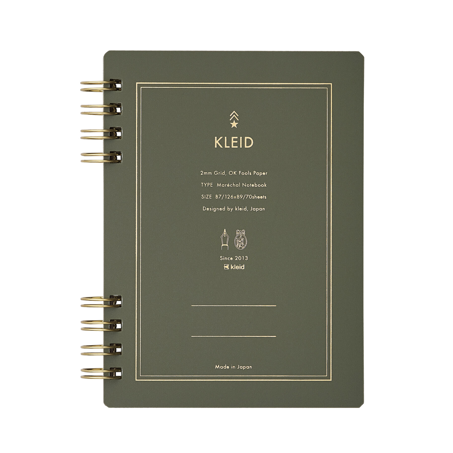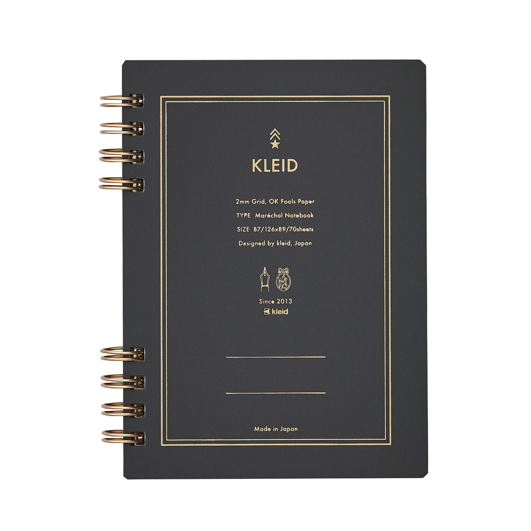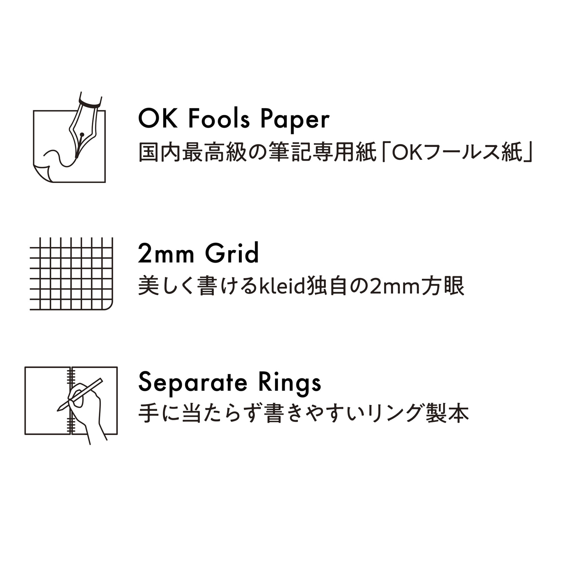 高級感のある全面箔が目を引く表紙は、丈夫で耐久性に優れたPP素材を使用。高級筆記専用紙「OKフールス紙」に、ページ分割可能なガイドが付いた2mm方眼。手に当たらず書きやすいリング製本など、充実の機能をクラシカル且つモダンに仕上げた、kleidのニューアイコンとなるノート。胸ポケットにも収まるコンパクトなB7サイズ。全2色5型展開。